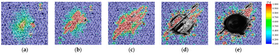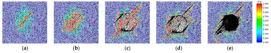 The strain distribution variations recorded with DIC on the exit sides of the holes are depicted in Figure 17, Figure 18 and Figure 19. The hole in Figure 17 was drilled at a spindle speed of 5000 rpm and a feed rate of 240 mm/min. Figure 18 represents the hole drilled at a spindle speed of 12,000 rpm and a feed rate of 240 mm/min. Lastly, Figure 19 displays the hole drilled at a spindle speed of 18,000 rpm and a feed rate of 720 mm/min. The strain distributions presented in Figure 17c, Figure 18c and Figure 13c exhibit high similarity, indicating analogous formation processes among the holes drilled with different cutting parameters: 5000 rpm and 240 mm/min, 12,000 rpm and 240 mm/min, and 8000 rpm and 240 mm/min, respectively. This similarity implies that the impact of feed rate on material deformation processes is more significant than that of spindle speed. Upon forming a complete hole, conspicuous red blocks are visible outside the hole in Figure 17e, signifying substantial deformations on the material surface surrounding the hole. Although these red areas with extensive deformations have not yet led to tearing damage, they diminish the material’s strength and can cause assembly failure. This occurrence is particularly pronounced at lower spindle speeds. The enlarged deformation area outside the hole diminishes as spindle speed increases, as shown in Figure 18e. However, higher spindle speeds escalate specimen vibration frequency and exacerbate thermal effects, potentially causing significant deformation in the material surrounding the hole. This is also why there are more zones with strain greater than 1% around the hole drilled at the highest spindle speed of 18,000 rpm, depicted in Figure 19e.