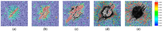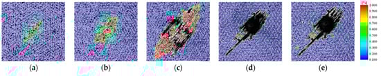 The variation trend for the strain distribution on the exit side of the hole at a spindle speed of 5000 rpm and a feed rate of 240 mm/min during drilling: (a) Stage 1; (b) Stage 2; (c) Stage 3; (d) Stage 4; (e) Stage 5.