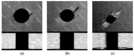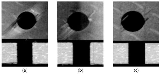 CT scan images of the three holes in the second group. (a) The hole drilled at the spindle speed of 5000 rpm and the feed rate of 240 mm/min. (b) The hole drilled at the spindle speed of 12,000 rpm and the feed rate of 240 mm/min. (c) The hole drilled at the spindle speed of 18,000 rpm and the feed rate of 240 mm/min.