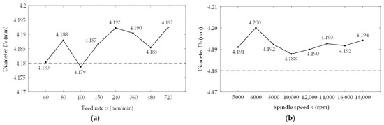 Variation trends for hole diameter with cutting parameters. (a) The variation trend for hole diameter with feed rate. (b) The variation trend for hole diameter with spindle speed.