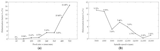 The damage evaluation factors are calculated using the calculation methods proposed in Section 2.2. The variation trends for the delamination factor with spindle speed and feed rate are depicted in Figure 22a,b. Figure 22a illustrates that the delamination factor increases as the feed rate rises while maintaining the spindle speed. At feed rates lower than 360 mm/min, the delamination factor exhibits a gradual growth trend. When the feed rate is higher than 360 mm/min, the delamination factor increases sharply. The delamination factor for the hole drilled at a feed rate of 60 mm/min is 0%, indicating that no apparent interlayer damage is observed in the axial direction of the hole. It is inferred that the hole only has intra-layer damage, without any delamination occurring. From Figure 22b, it can be seen that the delamination factor demonstrates an overall decreasing trend as the spindle speed rises under constant feed rate conditions. A comparison between the delamination factor’s variation trends from both figures suggests that higher spindle speeds and lower feed rates are more conducive to reducing delamination damage, and the influence of the feed rate on delamination is more evident than that of the spindle speed.