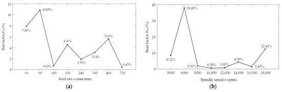 Variation trends for the burr factor with cutting parameters. (a) The variation trend for the burr factor with feed rate. (b) The variation trend for the burr factor with spindle speed.
