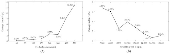Variation trends for the comprehensive damage factor with cutting parameters. (a) The variation trend for the comprehensive damage factor with feed rate. (b) The variation trend for the comprehensive damage factor with spindle speed.