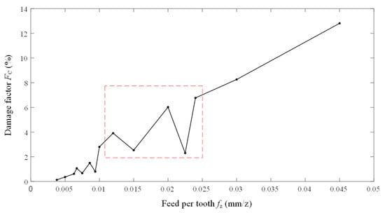 Figure 27 illustrates that, as feed per tooth increases, the damage factor exhibits a steady rise, with a notable rapid increase occurring after feed per tooth surpasses 0.01 mm/z. The part enclosed by the dashed rectangular frame shows significant twists and fluctuations. Upon comparing the data in the table for these five holes (ranging from a feed per tooth of 0.012 to 0.024 mm/z), it is evident that the drill operating at 0.0225 mm/z and 8000 rpm yields better results than one operating at 0.012 mm/z and 10,000 rpm. Additionally, higher feed per tooth and a lower spindle speed (0.02 mm/z and 6000 rpm, 0.024 mm/z and 5000 rpm) lead to more detrimental damage outcomes. It is worth noting that although the spindle speed of 8000 rpm is highly advantageous for feed rates below 0.02 mm/z, the extent of hole damage escalates rapidly as the feed rate continues to increase. This observation aligns with the findings derived from analyzing the feed rate.
