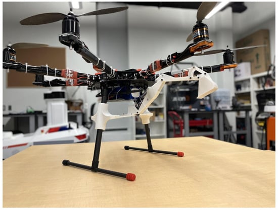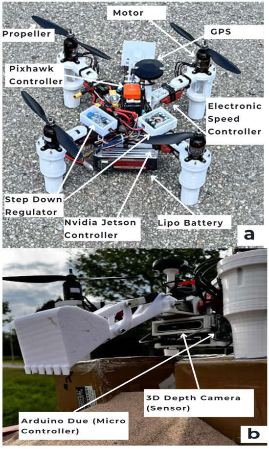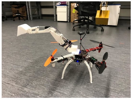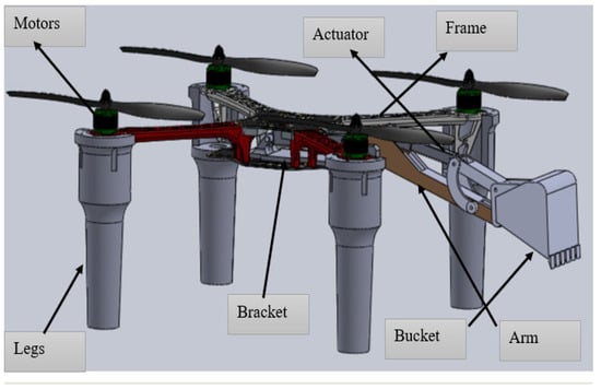 In addition, the platform’s design changed throughout the study in terms of the type of copter and the manipulator as well as the positioning of each component. In the first concept, we combined the F450 frame of the quadcopter with the boom, arm, and bucket of an excavator. As depicted in Figure 1, it is the most basic version of the quadcopter with the manipulator on top and all the other components attached to the bottom plate. However, this design failed because of its instability during flight since the platform’s center of mass was significantly shifted away from the center, causing unequal weight distributions and eventual collapse. Despite multiple attempts, the objective of autonomous excavation in flight mode was not achieved.