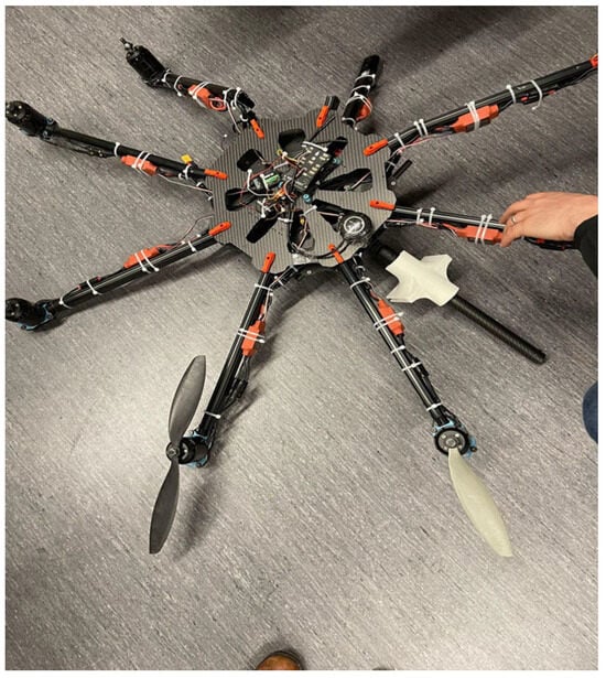 Following that, we replaced the quadcopter with the Tarot Octocopter, which is significantly larger than its predecessor. With the second design modification, depicted in Figure 2, the platform was successfully stabilized during excavation operations as it was equipped with eight Emax Grand Turbo motors capable of lifting huge loads and counteracting the back-tilting force. Nonetheless, the large weight of the second design platform, around 20 kg, makes it difficult to regulate and keep the same position throughout the whole excavation process, resulting in continuous deviations from the intended position. Due to this fault in position accuracy, the sensor mounted on the platform was unable to detect the target ground for excavation. After several experiment-related failures, as depicted in Figure 3, we considered another design change to solve this problem.