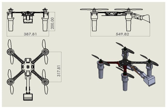 In the third successful design modification, we replaced the boom with a bracket, decreasing the overall manipulator length from 410 mm to 374 mm. The CAD model of the modified design is shown in Figure 4. This enables the platform to employ only two actuators for the arm and bucket, improving its balance. To sustain the load and neutralize the counterforces acting during the autonomous excavation process, motors with higher thrust ratings were installed to replace the existing motors. In addition, the legs were shortened from 300 mm to 100 mm to prevent the rotorcraft from tumbling over. The overall dimensions of the platform are shown in Figure 5.