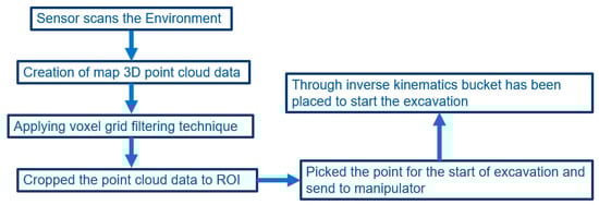 The whole algorithm for the detection using a D415 consists of a series of steps, as illustrated in Figure 8. In the first step, a cropping approach was employed to remove extraneous points and reduce the number of x and z points. Points within the region of interest (−0.1397 and +0.1397 m along the x-axis and +0.16 and +0.2 m along the z-axis) were transmitted to the controller for processing in the ROS environment. The D415 depth camera offers a standard field of view of 69° × 42° with shutter sensors capable of producing high-quality depth images. It mimics human binocular vision, utilizing two cameras positioned a short distance apart. The camera’s software identifies identical features of an object in each sensor, leveraging the slight positional variance to determine object depth via the triangulation method. Once the depth image is obtained, it is processed by using the ROS package to convert it into point cloud data. These data are then refined and cropped by using voxel-grid filtering to isolate the region of interest. The resultant point cloud data provide the coordinates, which are transmitted to the autonomous flying excavator to initiate the excavation.