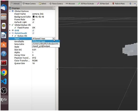 The ROS includes a component called RViz that enables the perception, cropping, and processing of the depth camera’s point cloud in the simulation. In Rviz, the fixed frame is the camera link, and the chosen profile to represent the point cloud is Flat Squares with a length of 0.01 m. Three topics are shown in Figure 9: /camera/depth/color/points shows the points in the field of view and /voxel_grid/output shows the filtered data of the field of view. Here, the voxel-grid filtering method was also employed to minimize the number of points so that the limited computer resources could be maximized.