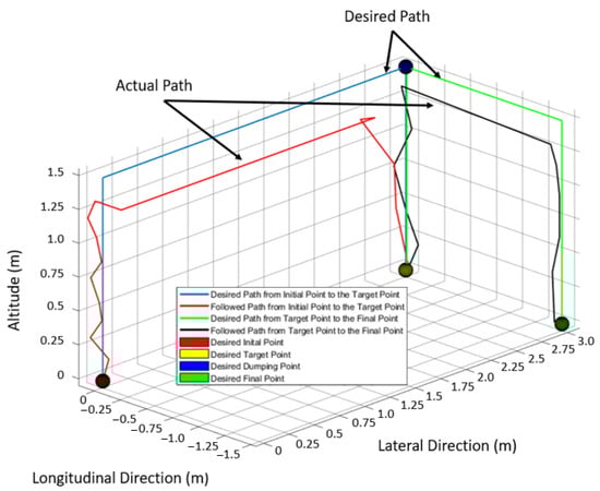 Figure 11 depicts the whole flight path in Scenario 1, where the blue and red lines represent the desired flight path and the drone’s actual flight path, respectively. The green line shows the drone’s desired path for soil disposal and arrival after collecting soil, while the black line represents the corresponding actual path. As seen in the figure, the developed prototype achieved autonomous excavation by managing positional precision and stability in Scenario 1. During the experiment, the platform flew through the same line five times, along with the desired path having a vertical distance of 1.5 m and a horizontal distance of 3.0 m, which was randomly selected according to the rough estimate of the battery timing. Using the RTK system and GPS, the platform’s position was established with centimeter-level precision. During the experiment, the target landing and actual landing positions for excavation are (0.000, 3.000) m and (0.004, 2.992) m, respectively. The RMSE value between the desired trajectory (blue line) and the actual flight path (red line) is 0.00894 m. The platform then finished the aerial dumping procedure and landed at the destination. In this case, the targeted and landing locations are (1.500, 2.992) m and (1.492, 2.995) m, respectively, and the RMSE between the desired path to the desired path (green line) and the actual one (black line) is 0.00854 m. For stability, the maximum permitted lean angle in loiter mode where the excavation was conducted is 30 degrees, and our drone maintained an average lean angle of 20 degrees throughout the entire experiment [].