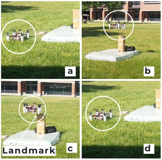 In the second scenario, the drone’s performance was evaluated airborne. In this test, the target sand for excavation was held on top of a tall box to maintain a certain height, and the drone was tasked with reaching the designated location and excavating without touching down. Figure 12 depicts the experimental setup (a to d). In Figure 12a, the platform was at a home location ready to take off in order to reach the top of the box. The platform successfully approached the target location by using RTK and GPS, which were helpful in achieving navigational objectives (Figure 12b). The platform excavated the soil autonomously in the air after reaching the designated target landmark (Figure 12c). Although the manipulator broke stability, the platform remained balanced during excavation. Then, it safely landed, as shown in Figure 12d. The drone is highlighted in each diagram with a white circle.