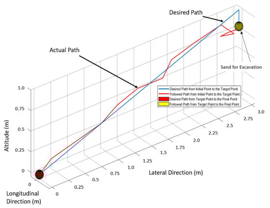 Figure 13 depicts that the platform attempted to perform the excavation task after flying autonomously to the target location (sand), which was placed at an elevation of approximately 0.75 m. In the figure, the blue and red lines indicate the desired and actual flight paths followed by the platform. The specified coordinates for the target and landing locations in the x and z dimensions are (3.0, 0.75) meters and (2.98, 0.73) meters, respectively. The Root Mean Square Error (RMSE) between the desired path (blue line) and the actual path (red line) is calculated to be 0.02 m, indicating high accuracy. The maximum lean angle that the platform reached was 20 degrees, which falls within an acceptable range. With loiter mode set to ensure stability, the maximum lean angle of 20 degrees was attained during excavation, while the average lean angle maintained throughout the experiment was 15 degrees.