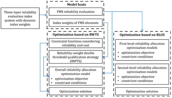For the above problem, in this work, the reliability-allocation optimization models of FMS considering cost and reliability are established based on the FMS reliability modeling presented in our previous study [], which was established based on a three-layer evaluation index system with dynamic weights. To better balance the convergence speed and optimization effect, two dimension-reduction strategies are proposed, and the optimization algorithms are presented to solve the optimization problem. Then, two main contributions of this work are as follows: (1) the overall reliability-allocation optimization based on RWTS is proposed, which dynamically reduces the number of optimization variables in each iteration by the threshold judgment of the reliability and index weight of basic elements; (2) the reliability-allocation optimization based on BLOS is proposed, which transfers the overall reliability-allocation optimization problem from FMS to basic element into several simpler allocation optimizations from FMS to subsystem and from subsystem to basic element, aiming to improve the convergence performance of optimizations. Finally, an application case to a box-parts finishing FMS is performed to show the advantages of the allocation optimizations based on two proposed strategies. In summary, the framework of the proposed method is shown in Figure 1, wherein the model basis provides the important foundation for the establishment of the optimization objectives and constraint conditions of the following optimization modeling.