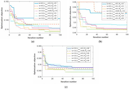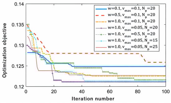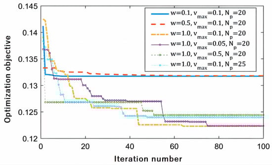 where is the inertia weight, which largely affects the global and local search capabilities, e.g., the larger the value is, the stronger the global search ability. By contrast, the stronger the local search ability; and are acceleration constants, which are generally located in the interval ; and are random values taken from the interval . Except for the above parameters, the flying velocity of each particle cannot exceed the maximum value. The research shows that the smaller the value is, the faster the convergence speed is, but the easier it is to fall into the local optimum. In practical applications, this value can be determined by the size of the variable intervals. Moreover, the number of particles will also influence the optimization performance and the value is the number of iterations, which should ensure that the global optimal solution can be obtained.