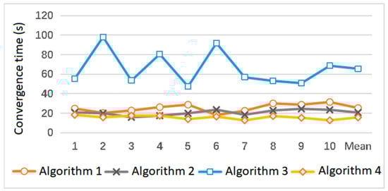 Figure 8 shows the comparison of convergence times of three algorithms, wherein denotes the average convergence time of 10 times optimization. From this figure, the convergence times of Algorithm 3 are significantly larger than that of other algorithms and are greatly affected by iterative randomness, while the convergence times of other methods are less affected by this randomness. Moreover, it shows that the average convergence time of Algorithm 4 is the smallest, which is 15.7473 s. Compared with Algorithm 1, Algorithm 2, and Algorithm 3, it is reduced by 38.03%, 23.95% and 76.01%, respectively.