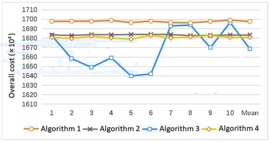 Curves of the overall cost based on four algorithms, wherein Algorithm 1 is the overall optimization algorithm based on RWTS, Algorithm 2 is the optimization algorithm based on BLOS, Algorithm 3 is the general overall algorithm, and Algorithm 4 is the optimization algorithm based on RWTS and BLOS.