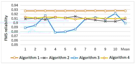 (2) On average, the FMS cost based on Algorithm 1 is higher than that based on other algorithms, which is 0.84% and 0.99% higher than that of Algorithms 2 and 4, respectively, but the reliability of FMS is also significantly higher than that of other algorithms, which is 2.05% and 1.79% higher than that of Algorithms 2 and 4, respectively.