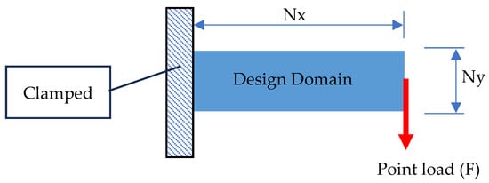 In TO, there are different approaches to representing the design domain. One approach involves treating the domain as a continuous area with changing borders. Another approach discretizes the domain into smaller elements that can be manipulated by a discrete optimization algorithm. In the case of TO utilizing simulated annealing as a non-gradient based method, the discretization method is often more compatible with the optimization algorithm. For this problem, the design domain is discretized into smaller elements, with Nx elements in the horizontal direction and Ny elements in the vertical direction, as illustrated in Figure 1. To simplify the problem and make it comparable with existing literature, the thickness of the beam is assumed to be uniform across the entire domain, effectively reducing it to a 2D problem. Each element in the discretized domain is a square with unit length.