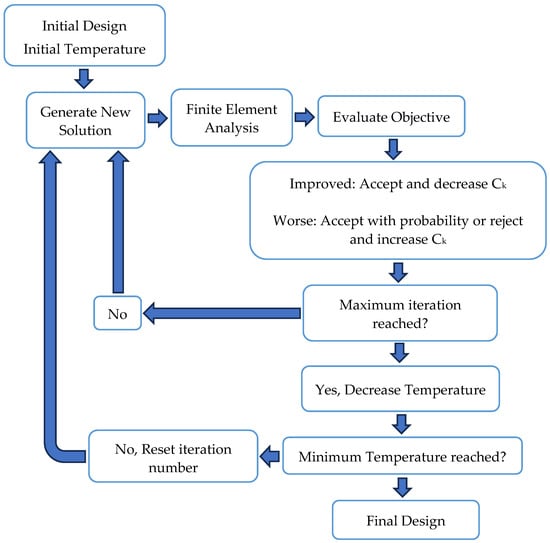 Simulated Annealing (SA) is a stochastic optimization algorithm that converges to an optimum solution by accepting or rejecting new solutions using the Metropolis–Hastings algorithm. In the SA optimization algorithm applied to TO, a critical aspect is generating new solutions within the design domain. A common way to generate these new solutions is by selecting a random element and altering its density, a process that introduces stochasticity into the search [36]. However, employing a purely random search can lead to relatively high computational costs and may not efficiently converge to the optimal solution. To enhance both computational efficiency and the convergence to the optimum solution, an auxiliary variable known as the crystallization factor can be used for each element. This crystallization factor can be interpreted as the significance or importance of each element within the objective function and is utilized to guide the generation of new solutions. The TO process begins with an initial solution, which consists of randomly distributed densities for each element (denoted as xj) and crystallization factors (denoted as Ck) for each element. A new solution is then generated using the previous solution and the crystallization factor, as outlined in Equation (3):