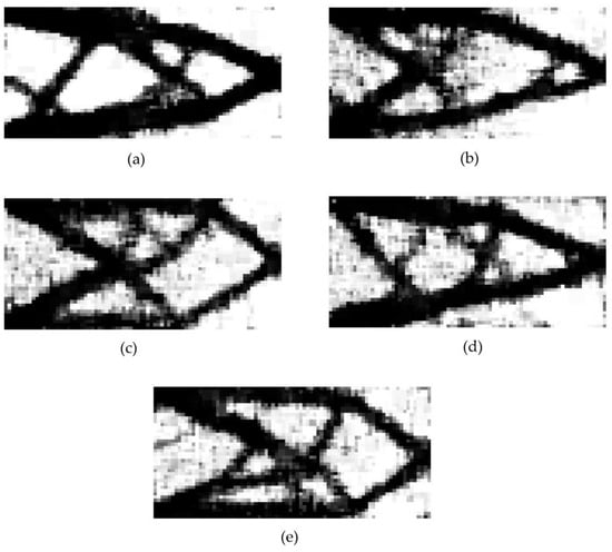 Results from topology optimization with simulated annealing for a 2D cantilever beam before post-processing. (a) Only point load applied at the top with no self-weight effect. (b) The self-weight load applied with a point load 25% of weight. (c) Self-weight applied with a point load 50% of weight. (d) Self-weight applied with a point load equal to weight. (e) Self-weight applied with a point load 200% of the weight.