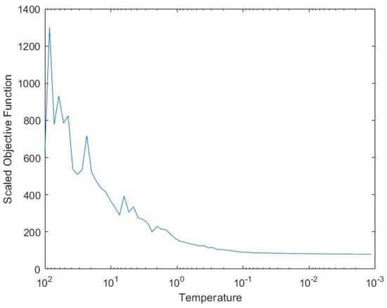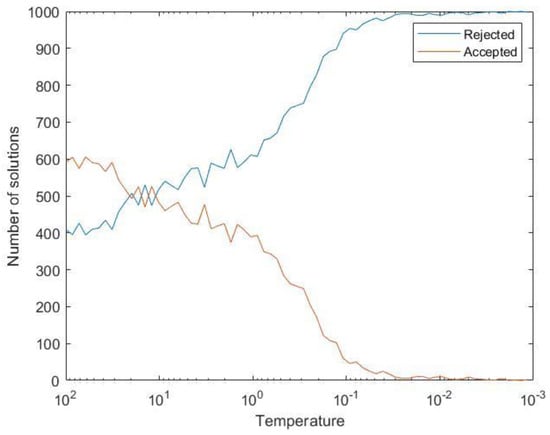 As shown in Figure 4, the objective function is converging to the optimum point near the minimum temperature. Similarly, the number of accepted and rejected solutions are shown for each temperature in Figure 5.