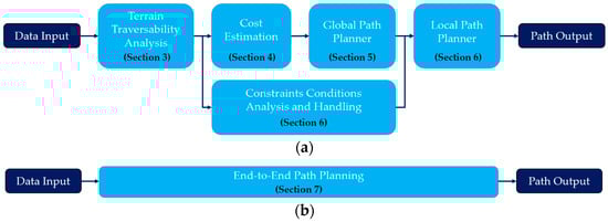Path planning in unstructured environments is categorized into two main broad categories in this article, presented in Figure 3. The first category involves the hierarchical path planning approach, which encompasses terrain traversability analysis, cost estimation, global path planning, constraint analysis, and local path planning [,]. Generally, the outcomes of terrain traversability analysis and cost estimation are utilized as input data for global path planners [,]. Subsequently, the local path is generated with the selected global paths and the limits of the constraints. The second category encompasses the end-to-end path planning approach, which directly outputs the path based on the learning methods according to the input of sensor data. The article is structured as follows: Section 3 introduces the terrain traversability analysis methods. Section 4 analyzes the cost estimation of safety, energy, and comfort. Section 5 summarizes the algorithms for global path planners. Section 6 concludes with the constraints and algorithms for local path planners. Section 7 reviews the learning methods of end-to-end path planning. Section 8 contains the conclusions. Section 9 proposes some suggestions for future work.
