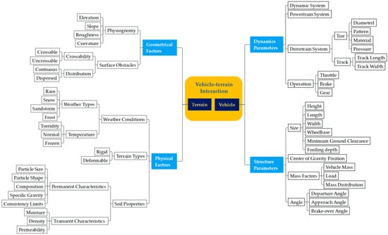 Terrain traversability of autonomous driving vehicles depends on the geometrical and physical properties of the terrain as well as the dynamics and structure parameters of the vehicle [,]. Simultaneously, there are complex interactions between the vehicle and the terrain. Figure 4 shows partial relevant factors of TTA.
