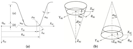 where and are the modified blade angle and head cutter point radius, respectively; and are tooth surface parameters, where is defined in the range of ; and are the head cutter fillet center radius and the fillet radius, respectively; and are tooth fillet parameters, where is meaningful when it is in the range . and are related by . The upper sign in “ ” and “ ” should be regarded for the concave side or outer blade, and the lower sign for the convex side or inner blade. Superscripts (a) and (b), (c) represent the straight edge and the fillet arc of the head cutter blade, respectively.