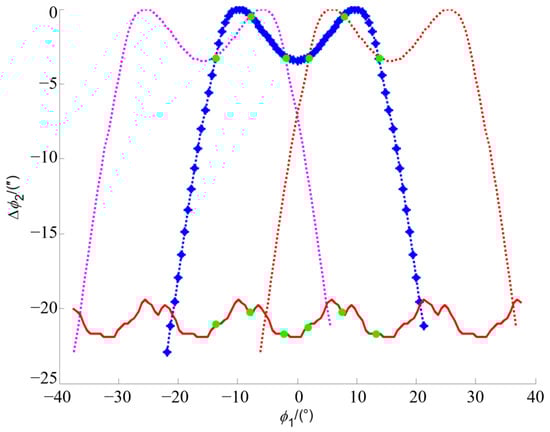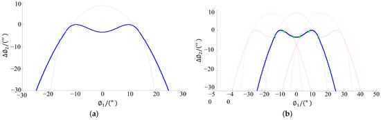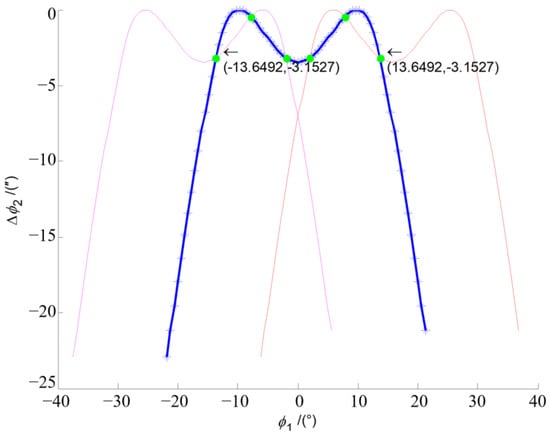 Step 4: Moving the combined curve in the thick line downward until the maximum point coincides with the abscissa, the final combined function of transmission errors (FTEs), i.e., the CMC, as in Figure 1b, is formed, in which the minimum point M denoted by represents the mean contact point. The CMC function of the spiral bevel gear pair can be represented as