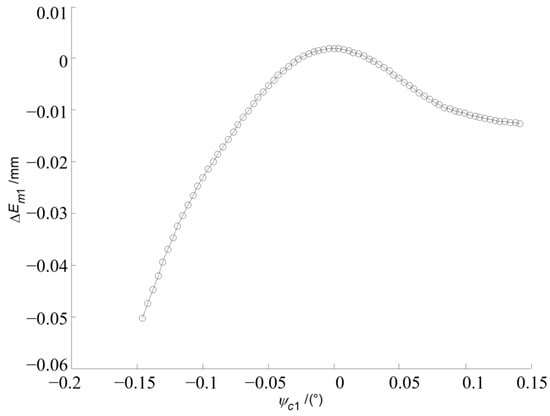 Step 1: Based on the local synthesis, calculate the machine-tool settings of the pinion at the mean contact point M. Three design requirements are given at the mean contact before the calculation is performed. They are the direction of the tangent to the contact path, the semi-major axis of the contact ellipse, and the magnitude of the FTE. Among the three design requirements, the third one is chosen around the maximum value of the fourth-order polynomial MC, as shown in Figure 1a. The instant blank offset is related to it. The actual machine-tool settings will be formed afterward according to the predesigned fourth-order polynomial FTE. Since an error exists at the mean contact point for the CMC, as shown in Figure 1b, the machine-tool settings of the pinion should be regulated to some extent by observing Equation (17).