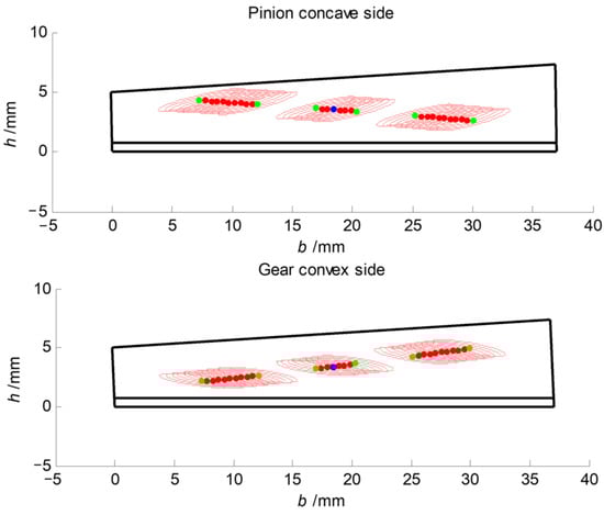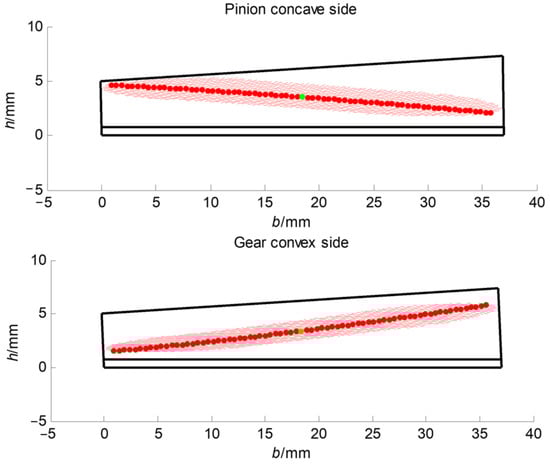 The variation in the instant blank offset with respect to the value at the mean contact point for the concave side of the pinion tooth surface is shown in Figure 6. The blank offset of the head cutter of the pinion changes with the CMC of the spiral bevel gear pair in Figure 5. The results of tooth contact analysis have confirmed that the predesigned CMC is fulfilled with sufficient accuracy as shown in Figure 7, in which the dotted points in the middle line represent the controlled points for the actual tooth pair, while the three continuous lines represent the CMC of TCA. Based on the numerical results of TCA of the spiral bevel gear pair, the maximum transmission error is −3.1527″. The difference between the maximum transmission error and the predesigned CMC is 0.1527″. As the gear is driven by the tooth pair with the least transmission error among three neighboring tooth pairs, the contact pattern of the actual tooth pair is scattered into three segments over the tooth surfaces, as in Figure 8, when the spiral bevel gears are considered as rigid bodies. The corresponding CMC of LTCA of the spiral bevel gear pair is shown in Figure 9. This is specific to the CMC and should not be taken as bridge contact, which is usually unacceptable. Based on the numerical results of LTCA of the spiral bevel gear pair, the maximum loaded transmission error is −22.0763″. Actually, when the loads are applied, contact patterns on tooth surfaces of the spiral bevel gear pair become continuous, and the maximum transmission error increases by −18.9236″ due to the elastic deformation of the meshing tooth surfaces as shown in Figure 10.