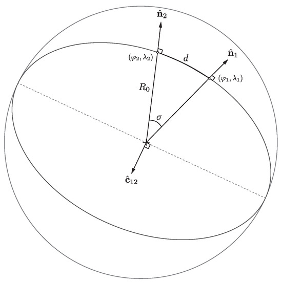 With reference to Figure 1, let and be the geodetic coordinates of two points on a spherical Earth with radius . The angle that is subtended by the two lines that extend from the origin through each point is . The orthodromic (i.e., great circle) arc distance between the two points is then