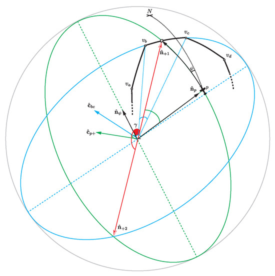 In order to determine the range of the vehicle to the geofence on its current heading the location of the two posts on either side of the current heading is required. Then, the intersection of the two great circle planes (one given by the position and heading of the vehicle, the other the plane containing both geoposts) will give the location of a point on the geofence the vehicle is heading towards. If defines the great circle containing the two geoposts, and , that straddle the vehicle’s heading, and defines the great circle containing the point where it intersects and the current position of the vehicle, p, then two possible antipodal intersection points exist: and . Which of these is the correct intersection for the geofence can be deduced by considering the angle between the heading and intersection n-vectors. With reference to Figure 2, if , then the heading vector, , points immediately towards . This amounts to . Conversely, (or ) indicates is pointing immediately towards . Therefore, the intersection vector can be written as