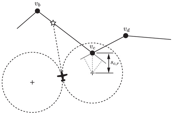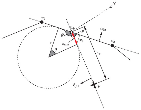 The angle , and hence , can be obtained using (8) where, in this case, the datum plane is with intersecting plane and focal point . If , the vehicle must begin turning to avoid crossing the geofence. Since the turn radius is affected by the airspeed using its current value, V, provides the current minimum turn radius for the vehicle: