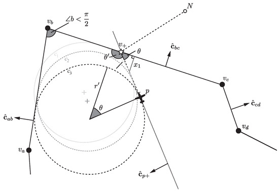 The approach so far is satisfactory when all of the internal angles of the geofence are reflex or obtuse. A problem arises when the angle between two fences is acute. In this scenario, as illustrated in Figure 4, such that the vehicle will be driven towards the vertex of the two fences at post b and eventually penetrate the fence. Furthermore, if the turn is initiated when , then the vehicle will be unable to complete a full turn, as the turning circle extends out of the geozone. In order to avoid this event, consideration of the two fences on either side of the one currently being approached is needed, along with the minimum turning circle. If the vehicle approaches an acute vertex, it must initiate a turn sufficiently soon enough to not lead to an excursion (turning circle in Figure 4).