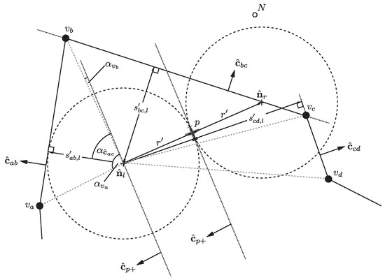 Then, the range to the geofence, , is the distance from to , solved with (2). For the case of a concave geozone, where multiple fence edge intersections exist, s is calculated for each intersecting point, i.e.,