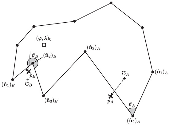 Consider the scenario in Figure 7, where the vehicle at has left the geozone. The closest post is given by the n-vector, , determined by the smallest value of . The posts on either side of this are given by and , and the three vertices form a spherical triangle. A point inside this triangle will serve as a useful point to orient that vehicle towards in the event of crossing the fence. The lengths of all three sides are known, so the centroid is easily computed: