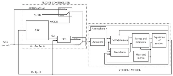 The ARC algorithm discussed in the previous sections is demonstrated in a simulated environment written in MATLAB/Simulink. Figure 8 outlines the structure of the simulation model. The vehicle model is generated from aerodynamic stability and control derivatives that compute the aerodynamic forces and moments acting on the vehicle. A propulsion subsystem models a combustion engine with a propeller. Inputs to these are the control surface deflections and throttle inputs. The forces and moments from both the aerodynamic and propulsion models are combined to determine the forces and moments acting about the c.g., which is used to solve the equations of motion. The motion states are used to further influence the aerodynamics, propulsion, and atmospheric model (for air density). Motion states are fed into the flight controller for the flight control system (FCS) as well as the ARC. For these specific simulations, a fixed-step Runge–Kutta integration solver is used with a time-step of 0.01 s.