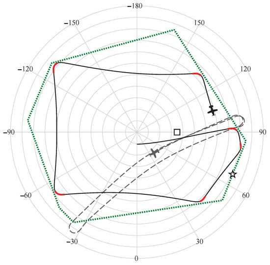 It is worth noting that this approach has no penalty when approaching obtuse or acute fence corners and will work in most cases. This will result in the vehicle returning to the geozone more quickly than if it were to fly towards the base location, denoted by □ in Figure 7. However, it can be seen that this approach will not work when the internal angle, , is reflexive, such as in the case of example B in Figure 7. The closest post to the vehicle is , which has a reflex internal angle . As a result, the spherical triangle formed from the three nearest posts and, hence, the anchor point is outside the geozone. This can be easily solved by rotating by 180 degrees for such cases (the resulting trajectory is shown by the dotted line in Figure 7).