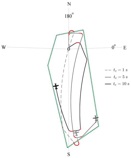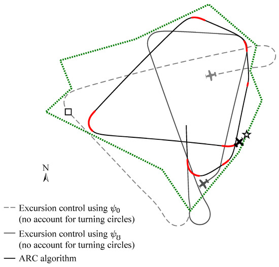 In the case illustrated in Figure 5, the distance to the approaching fence , despite the fact the turn should be initiated to avoid an excursion. Hence, both approaches in Section 3.2 and Section 3.4 should be evaluated. If approaching the geofence with sufficient clearance on either side, the criterion on the last turning circle inside the geozone amounts to a similar criterion as . The main difference is that the transient turn dynamics is now incorporated into the turning radius ( is used instead of r), whereas in the approach in Section 3.2, the transient turn dynamics are incorporated in the computation of . Of course, if the geofence corners are closely packed together and are particularly acute, an excursion may be unavoidable due to the maneuvering limitations of the vehicle. A judicious design of the geozone would therefore be sensible to avoid problematic corners.