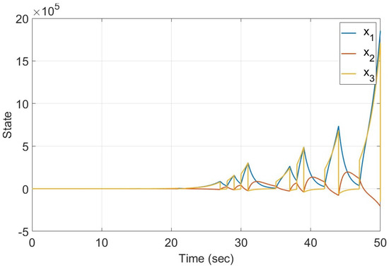 Figure 1 shows the state trajectories for the unforced case, i.e., . It indicates that the SDHS with the given system parameters is unstable. To render the closed-loop system stochastically admissible, control input derived from Theorem 2 is applied. In this example, we solve an optimization problem that minimizes in Theorem 2, and the following control gains with minimal are obtained: