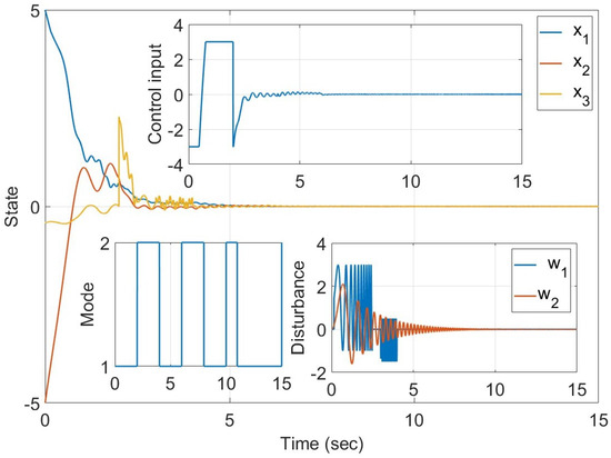 The state trajectories of the closed-loop system are depicted in Figure 2. The initial state is considered, and mode evolution and disturbance are also illustrated in Figure 2. Since a saturation level of 3 is considered, control input cannot exceed this limit.