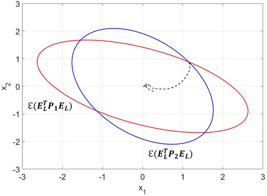where is defined in (23). This representation is valid only for the states within the set . To ensure that the range of states belongs to the set , we need to consider a set-invariant condition for the set . Before deriving it, let us define an ellipsoid using the condition (58):