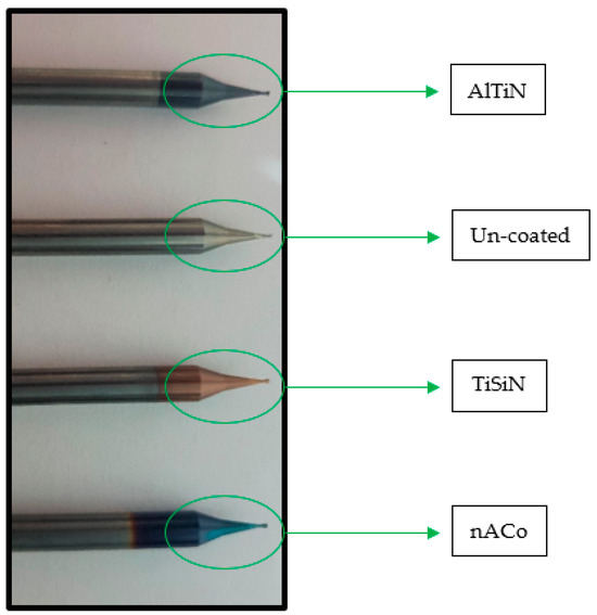A CNC milling machine, as shown in Figure 1, was used for the micro-milling testing of nickel-based super alloy Inconel 718. Initially, the surface of the workpiece was leveled using a carbide end mill with a 12 mm diameter. The surface was then used as a reference point throughout the design process. To ensure precise z-axis measurements, a tool pre-setter was employed. Table 1 contains adopted test parameters. Wedge-shaped tungsten carbide cutting tools with different coatings (nACo, AlTiN, TiSiN and uncoated), as shown in Figure 2, were utilized. These tools had a diameter of 0.06 inch (0.5 mm), whereas the average cutting edge radius of micro tools with nACo-, AlTiN- and TiSiN-coated cutting edges was 1.3 mm, 1.21 mm and 3.0 mm, respectively. The milling operation was carried out in a full-immersion machining environment.