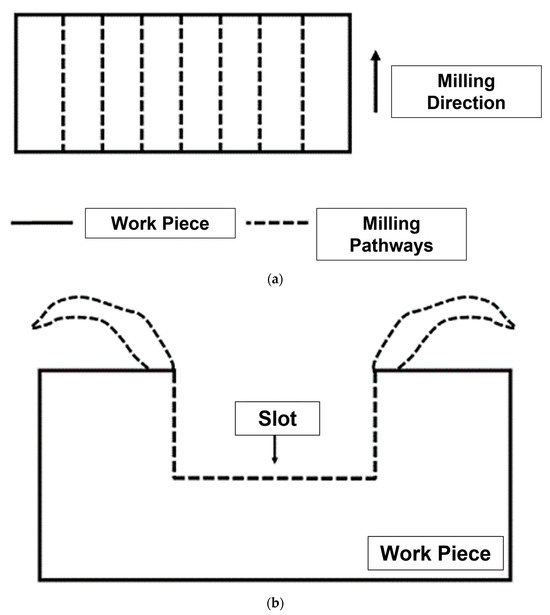 The workpiece was prepared with dimensions of 146 mm, 10 mm and 22 mm using electrical discharge machining. To minimize tool wear and tear, experiments were carried out with a 10 mm slot in the cutting length. Slot spacing was kept at 2 mm. Figure 3 displays the schematics of the milling operation, where Figure 3a shows the top view of the workpiece with intended milling pathways, and Figure 3b depicts the side view of the milling slot. The material was initially ground and polished. The waterless itching treatment from Kalling was applied for 5 s. The average grain size was found to be 23.4 µm using an Olympus DXS1000 digital microscope (Olympus Corporation, Tokyo, Japan) and ASTM standard procedure. Vickers hardness of Inconel 718 was found to be 361 HV using a Vickers micro hardness tester.