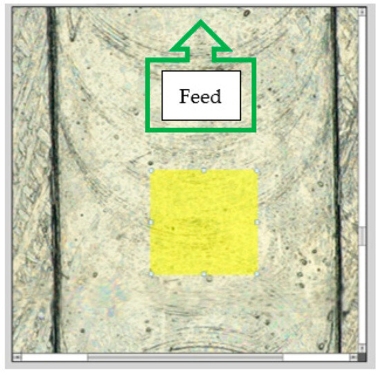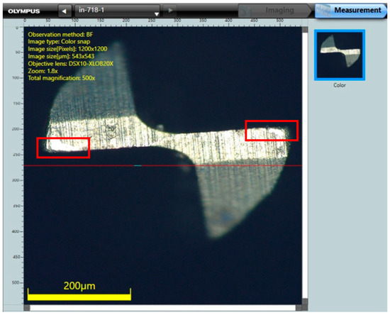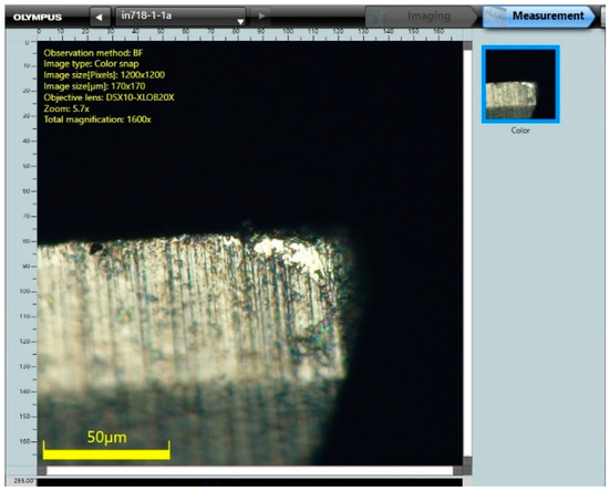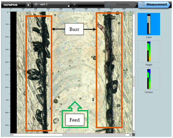 Tool wear, surface roughness and burr measurement were measured and analyzed during the conduct of the research. An Olympus DXS1000 digital microscope was used to quantify the tool wear response. One such insert is displayed in Figure 4, depicting tool wear. In addition, the Olympus DXS1000 digital microscope was utilized to examine the surface roughness (refer to Figure 5) owing to its capability to ascertain micro-surface roughness with high precision. Surface roughness for each machining condition was measured at 5 separate locations, and average value was determined to ensure accuracy. ISO 21920-2:2021 [40] was referred to for specification of surface roughness. With reference to burr analysis, there are various points on a machined surface where burrs can develop, including top, bottom, entrance and exit burrs, as shown in Figure 6. In the current study, the top and down burr height and width were the main areas of interest during burr analysis. Measurements of burr width and burr height were made, as depicted in Figure 7, using the DXS1000 digital microscope. Each machining combination was conducted three times to measure output response. The output responses were then used to analyze various aspects of the machinability of Inconel 718, including the effects of input parameters, as well as identification of influential machining parameters in terms of contribution ratio. The complete research methodology of the current work is displayed in Figure 8.