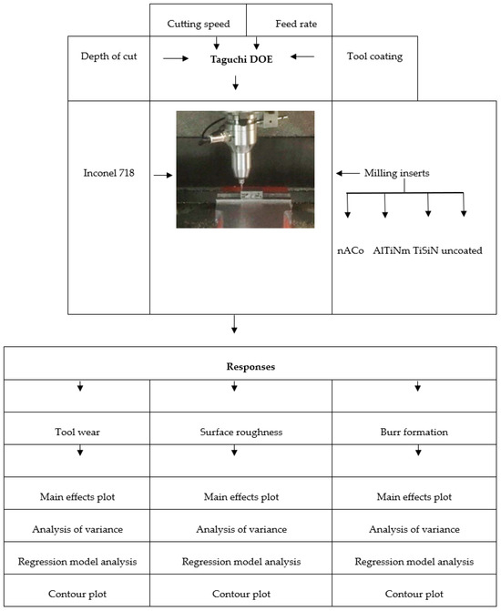 Input parameters of cutting speed (Vc), feed rate (fz), depth of cut (ap) and tool coating (tc) were selected to analyze machining responses. These input parameters were employed due to their influence on surface roughness, tool wear and burr formation [33,34,35,36]. The ranges of input parameters, as shown in Table 2, were determined from the literature [37,38]. An L16 orthogonal array was formulated based on a Taguchi design of experimentation, as shown in Table 3. A Taguchi design of experiment is a robust substitute for full factorial experimentation. It produces valid and conclusive results with a lesser number of experimental runs. Various past researchers have used it to draw meaningful conclusions, as available in the literature. Each of the sixteen experiments was run three times to ensure repeatability [39]. A new insert was used for each of the 48 experimental sets. This was necessary to determine the specific tool wear corresponding to each set of machining combinations.
