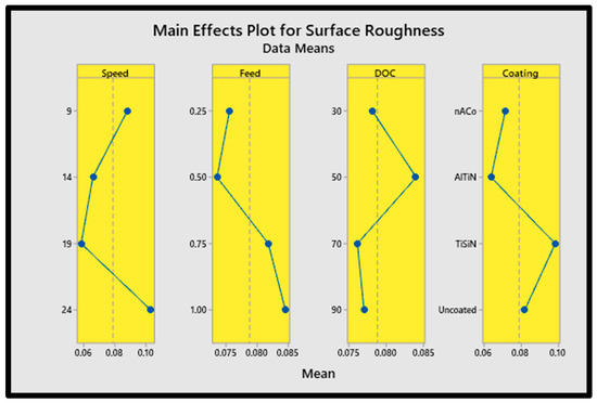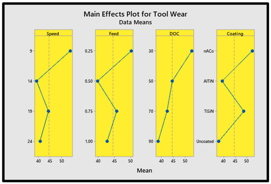 The effect of individual input parameters is displayed as the main effects plot given in Figure 14. One observation related to tc is that the nACo-coated tool produced the smallest burr in all cases, except in case of of burr width when down-milling. On the contrary, the TiSiN-coated tool yielded the highest recorded burr width and burr height in both up-milling and down-milling conditions. A probable reason for this is the highest coefficient of friction of the TiSiN-coated tool, resulting in intense shear deformation during milling. The cutting edge radius (mentioned in Section 3.1) is a significant parameter in comparison to fz since, at fz values higher than the cutting radius, lesser burrs were formed. Furthermore, it was found that increasing Vc resulted in a larger burr because Vc caused significant changes in cutting temperature [43]. A significant positive shift in burr formation was observed at 0.5 mm, which is the cutting edge radius of the milling tool. The exact effect of input variables was quantified using analysis of variance, given in Table 7, Table 8, Table 9 and Table 10. Ap was identified as the significant input in the case of burr height for both up-milling and down-milling with contribution ratios of 45.12% and 23.25%. On the other hand, fz was the dominant parameter for burr width, having contribution ratios of 39.28% and 36.26% for up-milling and down-milling, respectively. For burr height and burr width (up-milling), Vc proved to be insignificant, whereas ap was found to be insignificant for burr width during both up-milling and down-milling machining. Tc was singled out as the input variable with significant influence on process output (burr formation) in all four cases analyzed. The optimum conditions for minimum burring for the four desired cases (burr height and burr width for both up-milling and down-milling) were noted for the conduct of subsequent validation experiments.