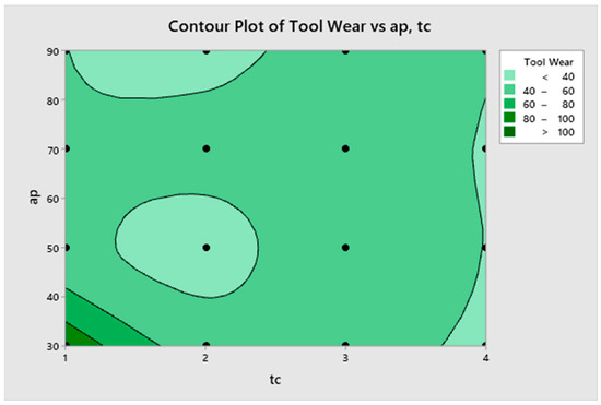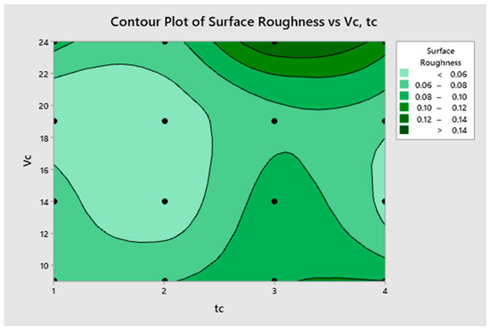 The main effects plot and analysis of variance of input cutting parameters, along with different tool coatings on surface finish, are given in Figure 12 and Table 6, respectively. With respect to Vc, surface roughness tended to slightly decrease before elevating as Vc was increased from 9 to 24. The effect of tc on surface roughness was also evident, with the AlTiN-coated tool yielding the best product quality. This is owing to the low thermal coefficient, which keeps the cutting zone temperature in check. This results in lower tool wear which, in turn, produces better surface quality. It can also be seen that surface integrity diminished with an increase in both fz and ap, although the effect was minimal and seems insignificant. A higher fz facilitates a higher volume of machining. The surface quality is affected by tool wear brought on by a machining operation, as already mentioned above. One of the most important elements in surface finish is the tool’s cutting edge radius [42]. It is preferable to micro-mill on the smallest chips in order to create good surface roughness because doing so minimizes surface distortion and therefore enhances surface clarity. The best and worst results in terms of surface roughness were predicted to occur at 19 m/min Vc, 0.25 fz μm/tooth, 70 μm ap with the AlTiN-coated tool and 24 m/min Vc, 1.00 fz μm/tooth, 50 μm ap with the TiSiN-coated tool, respectively. In order to quantify the influence of input variables on surface roughness, analysis of variance was conducted, with results displayed in Table 6. Fz and ap were found to be insignificant owing to their meager effect on surface roughness, whereas Vc and tc were identified as the most effective members with contribution ratios of 51.24% and 34.27%, respectively. Another comparison of the different tool coatings used in this work was made through the analysis of regression equations, as given by Equations (5)–(8). The equation for the AlTiN-coated tool was the most efficient, with the least positive intercept of 0.0402, as it was based on a smaller-the-better model. In comparison, the AlTiN tool was 17%, 49% and 91% more effective than the nACo-coated, uncoated and TiSiN-coated tools, respectively. In order to find the optimum combinations of vital inputs, a contour plot was drawn. The result is displayed in Figure 13. Here, the brighter area of the graph represents better surface finish. The black circular points highlight the combination of various tc values at certain Vc values. This is a substantial visual tool for optimizing the output response.