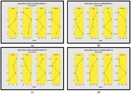 Main effects plot for burr formation: (a) burr width up-milling; (b) burr height up-milling; (c) burr width down-milling; (d) burr height down-milling.
